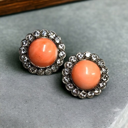Vintage 14K Transitional Diamond Cabochon Pink Coral Rosetta Stud Earrings 3.20c