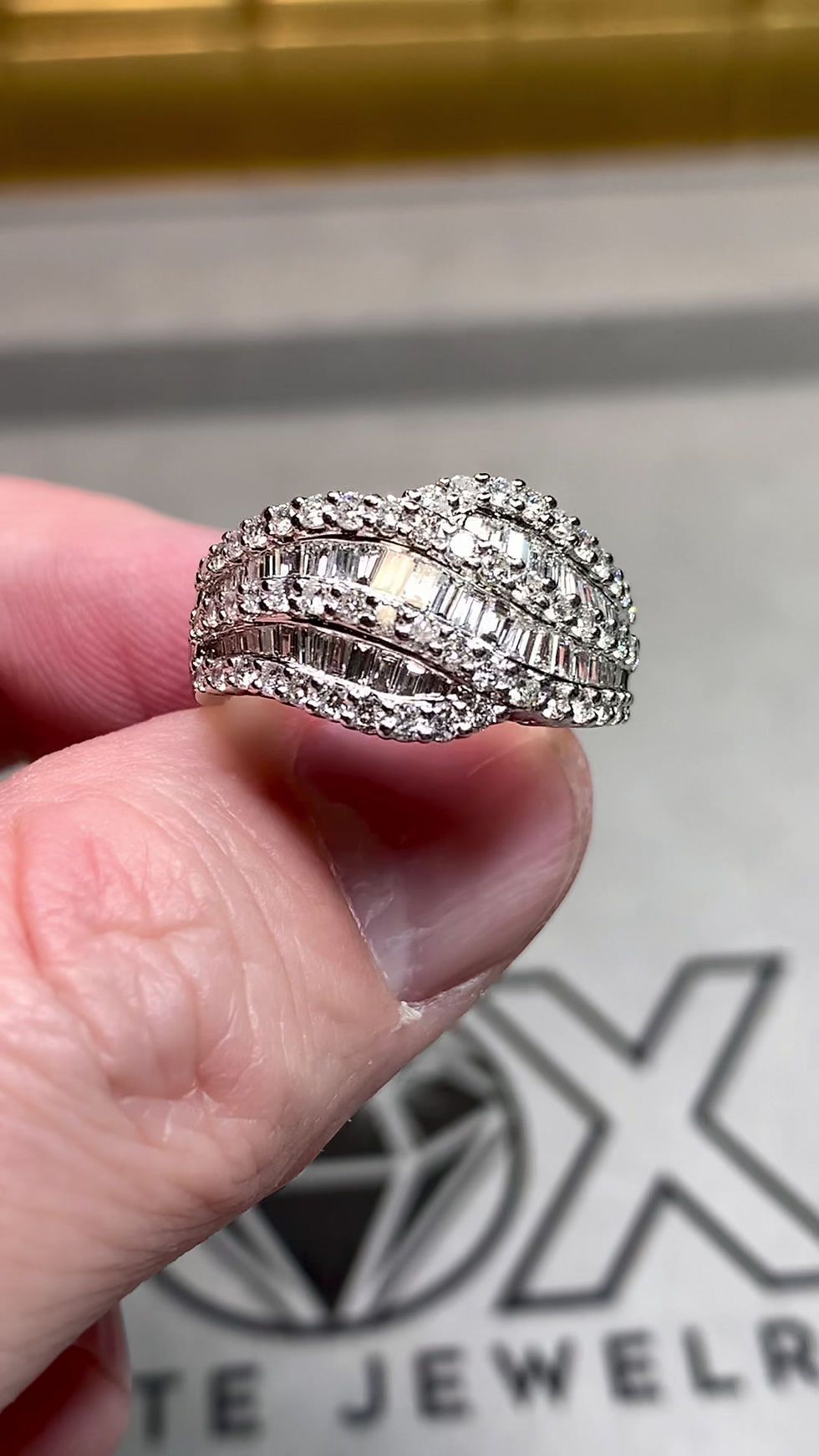 A gorgeous, contemporary necklace crafted in 18K white gold and pavé set with an approximately 4.35ctw in H-J color Si1-i1 clarity round diamonds. It has been done in a bold, multi-chain link design to be worn in an almost offset manner. An absolutely stunning piece that can be worn both day or night and just about any occasion depending on how much attention you wish to garner!