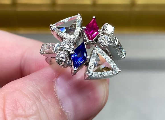 An original 1950s platinum bypass ring designed with a precise, balanced composition of form and color. Two opposing trilliant rose-cut diamonds are set back to back, displaying broad, antique faceting that gives a more understated, reflective brilliance. They are separated by a kite-shaped natural sapphire and ruby, introducing strong saturation and contrast within a sharply defined geometric layout. The design is supported by round and baguette diamonds that provide structure without interrupting the overall symmetry. The result is a highly intentional mid-century piece with clear attention to proportion and construction.